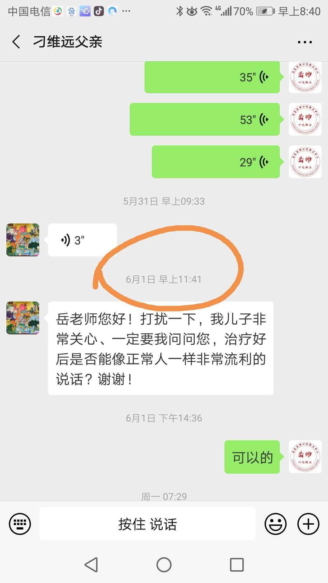 小刁的父亲给予岳老师很高的评价,我们也非常的感谢各位家长对于我们的信赖。我们的初心就是:希望能够帮助更多因为口吃,而困扰的朋友们从心理问题的阴影中走出来,彻底的改变自己,做到流畅快乐的说话。