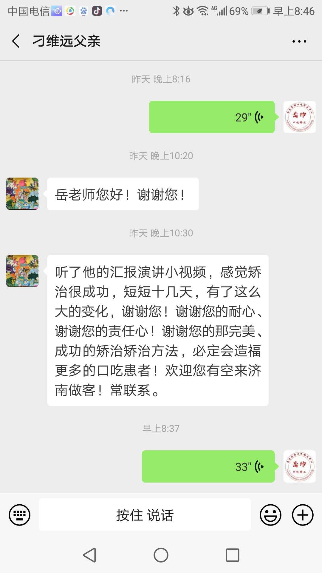 小刁的父亲的反馈。小刁矫正后他的父亲说:岳老师,听了他的汇报演讲视频,感觉矫正很成功,短短十几天,有那么大的变化,谢谢您!谢谢您的耐心、谢谢您的责任心。谢谢您的那么完美成功的矫正方法,必定会造福更多的口吃的人。
