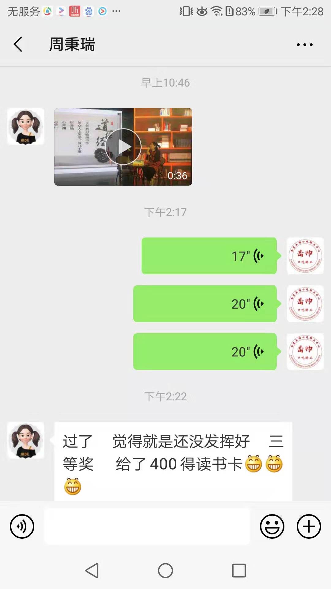 小周回到生活中1年反馈。小周参加学校组织的讲课比赛。在反馈中说道:感觉自己还没有发挥好,荣获三等奖,给了400的读书卡。